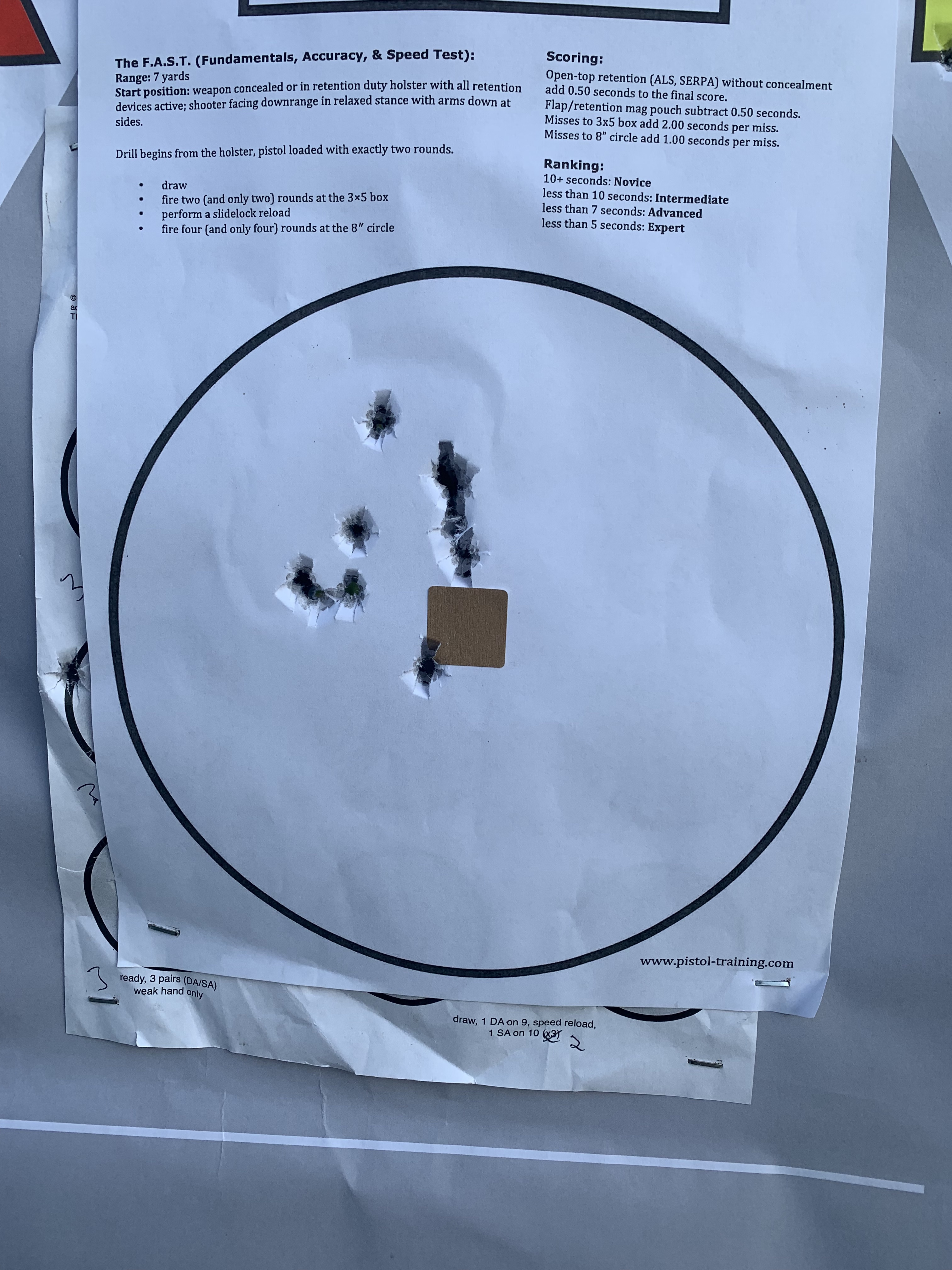 At this point I had shot 90 rounds ( F.A.S.T. -18; Casino x2 – 42 and DT -30). My intention was to shoot the last 10 rounds at a B8 center. Unfortunately, I was out of them so I just put a paster in the 8″ circle of a F.A.S.T. Target and used that as a bullseye. I shot those shots at 10 yards, standing unsupported. I wasn’t happy with these shots, but it was my own fault for being in a hurry. I didn’t take them time I should have.