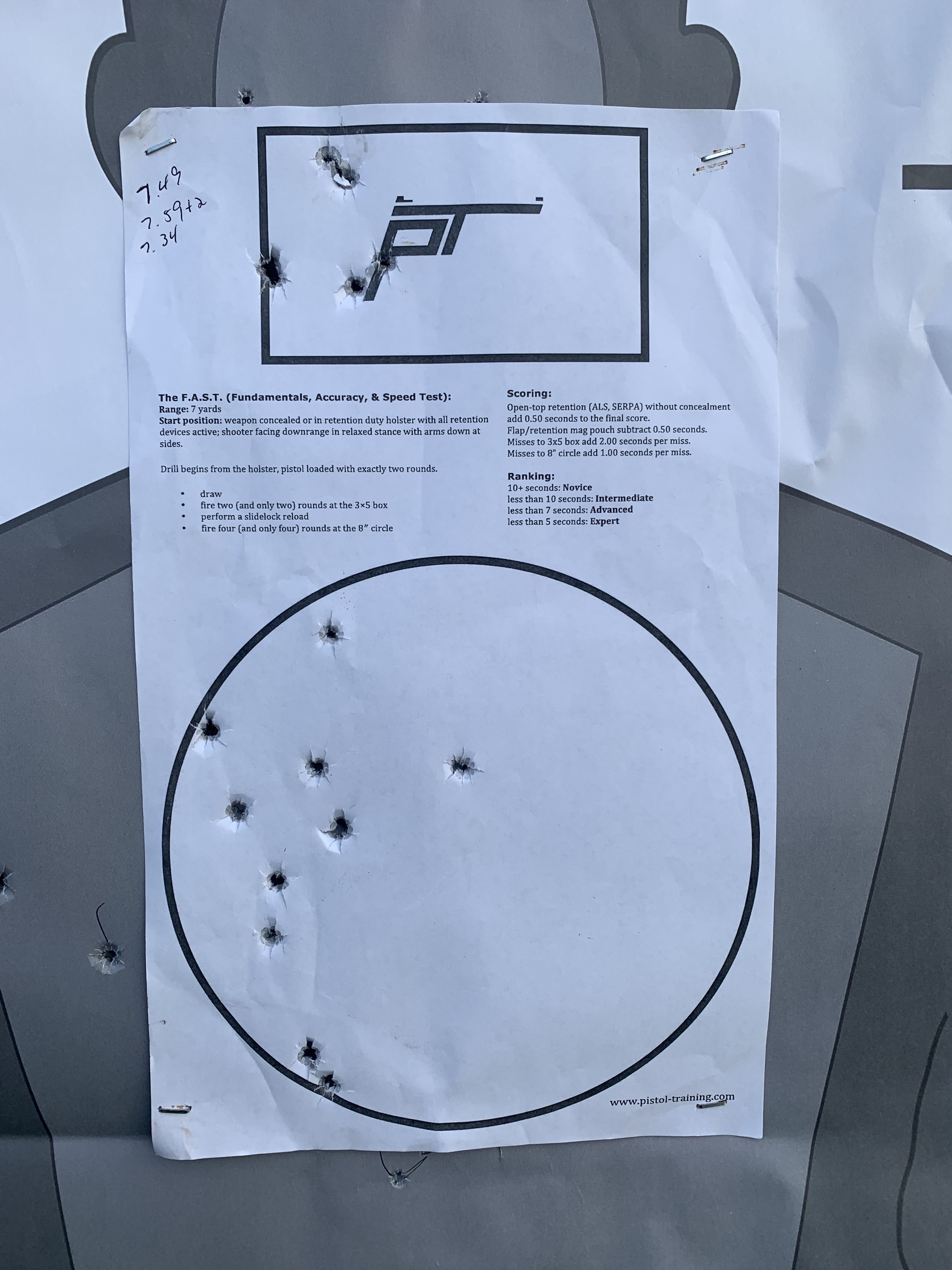 The F.A.S.T. Is supposed to be shot cold so I started with that. Normally I can shoot the F.A.S.T. in about 5.5 seconds. I ran the F.A.S.T. 3 times – 7.49 clean, 7.59 (+2 seconds for misses) and the final run was 7.34 clean.